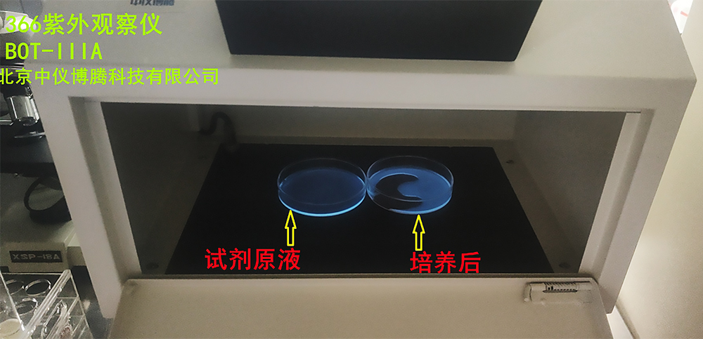 大腸埃希氏菌測定熒光觀察使用方法:將臺(tái)式紫外光燈置于暗處,插上電源,將經(jīng)過24小時(shí)培養(yǎng)后的EC-MUG管在燈下照射,如有藍(lán)色熒光產(chǎn)生則為大腸埃希氏菌陽性管;